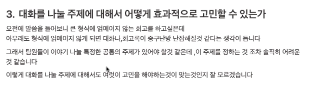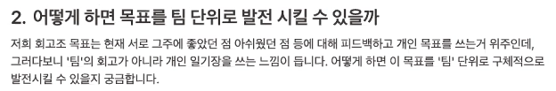 오히려 민원시간의 은혜님과 같이 서로 토크를 하다보면 자연스럽게 나오는 그런 고민들이 피드백이 필요한 찐 무드이고 더 효과적이지 않을까