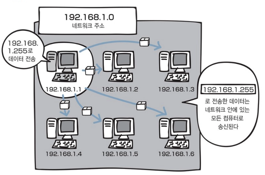 브로드 캐스트 주소는 네트워크에 있는 컴퓨터나 장비 모두에게 한번에 데이터를 전송하는데 사용되는 전용 IP 주소이다.