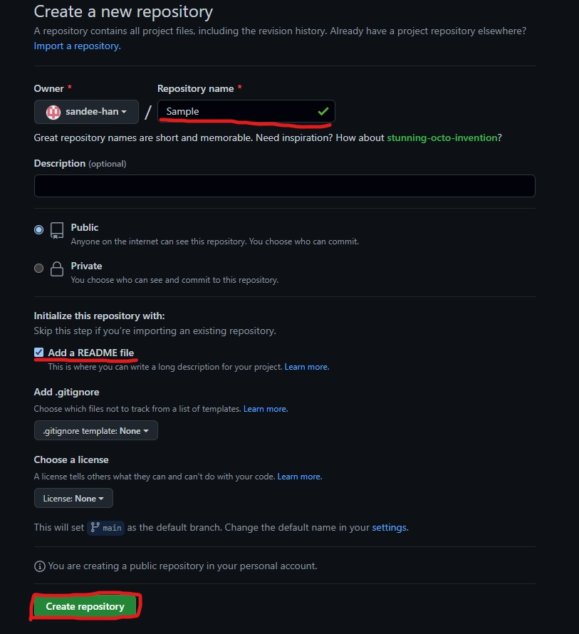 Repository의 이름을 설정하고 생성할 수 있다.