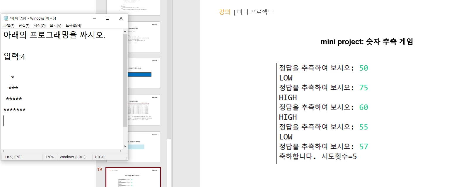 숫자 추측게임 : 아래와 같은 출력이 나오도록 프로그램을 짜시오.