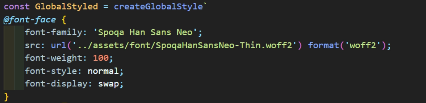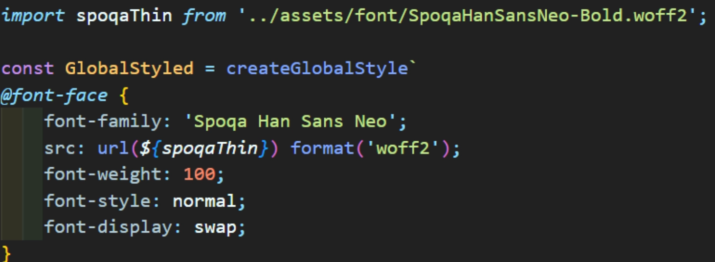 - ๊ธฐ์กด์๋ ํฐํธ ํ์ผ์ ๊ฒฝ๋ก๋ฅผ url์ ์ธ์๋ก ์ง์ ์ ์ผ๋ก ๋ถ๋ฌ ์์๋ค. ๊ทธ๋ฌ๋ ๋ฆฌ์กํธ์์๋ ๊ฒฝ๋ก๋ฅผ ์ธ์๋ก ์ง์ ์ธ ๊ฒฝ์ฐ ๋ฆฌ์กํธ ์คํ์ ๊ฒฝ๋ก๊ฐ ๋ฐ๋์ด๋ฒ๋ฆฌ๊ฒ ๋๋ค. ๋ฐ๋ผ์, ํ์ผ(์ด๋ฏธ์ง, ํฐํธ)๋ฅผ ๊ฐ์ ธ์ฌ ๋๋ ๊ฐ ํ์ผ์ด ์ฌ์ฉ๋๋ ๋ถ๋ถ์ ๋ฐ๋ก ๊ฒฝ๋ก๋ฅผ ์ ๋ ๊ฒ์ด ์๋๋ผ ๋ฐ๋ก import๋ฅผ ํด์ ๊ฐ์ ธ์์ผ ํ๋ค.