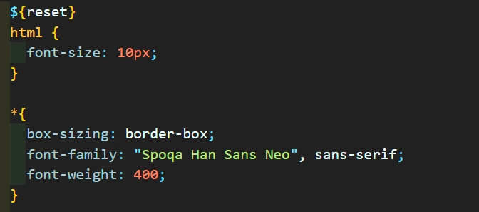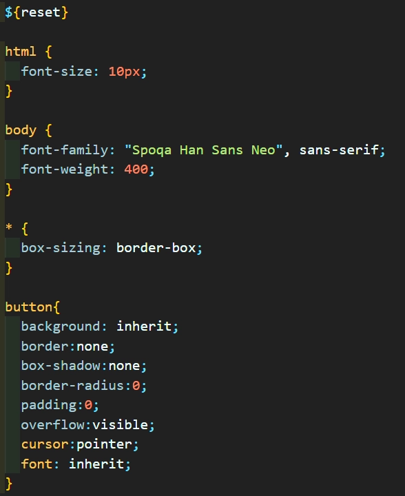 - ๊ทธ๋ฌ๋ ํฐํธ๊ฐ ์ด๋ค ํ๊ทธ์๋ ์ ์ฉ์ด ๋๊ณ , ์ด๋ค ํ๊ทธ๋ ์ ์ฉ์ด ์๋ผ๋ ๋ฌธ์ ๊ฐ ์์๋ค. ์ด๋ CSS ์ฐ์ ์์ ๋ฌธ์ ์๋ค. ๊ธฐ์กด์๋ font-family๋ฅผ * (์ ์ฒด ์ ํ์)์ ์์ฑํ์๋๋ฐ reset css์ ์ ํ font:inherit์ ํ๊ทธ ์ ํ์์ ์์ฑ๋์ด์์ด ๊ฐ์ค์น ์ ์๊ฐ ๋ ๋๊ธฐ ๋๋ฌธ์ ์ ์ฒด ์ ํ์์ ์์ฑํ font-family๊ฐ ๋ฌด์๋๋ ๊ฒ์ด์๋ค. ๋ฐ๋ผ์, reset css์ ํฌํจ๋์ง ์์ ํ๊ทธ๋ค(button)๋ง ํฐํธ๊ฐ ์ ์ฉ์ด ๋๊ณ , ๋๋จธ์ง๋ ์ ์ฉ์ด ์๋๋ ๊ฒ์ด์๋ค.
