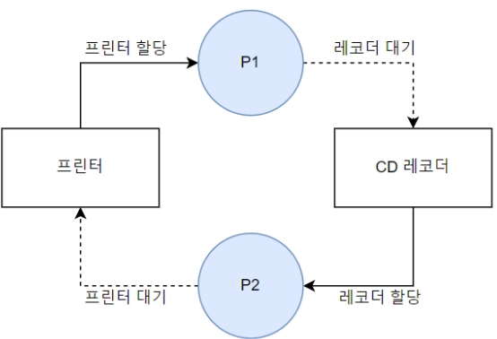 다중 프로그래밍 시스템에서 2개 이상의 프로세스가 다른 프로세스의 작업이 끝나기만 기다리며 작업을 더 이상 진행하지 못하는 상태