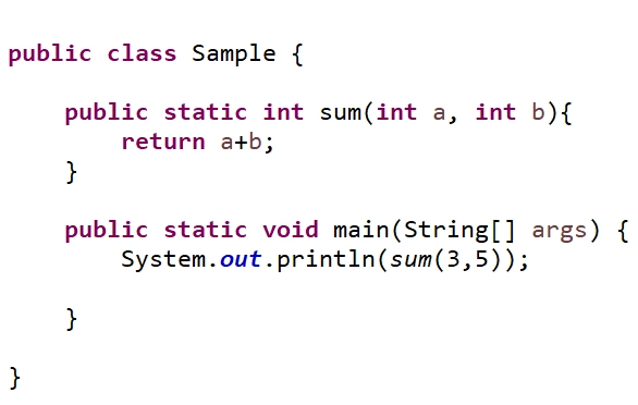 main 메소드가 먼저 실행이 되고 sum 메소드를 호출하는 sum(3,5)에서 3과 5가 인자이다. 3과 5의 값을 sum 메소드에서 int형 변수 a, b로 받는다. () 안에 있는 int a , int b매개변수이다