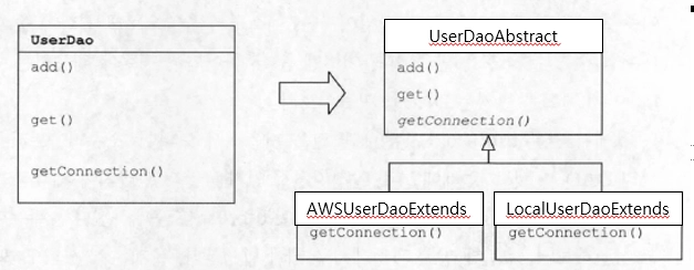 자유로운 확장을 위해서 openConnection() 메소드 이름을 사용했지만, UserDao 내에 있는 add()/get() 메소드의 커넥션을 가져오는 코드를 일일이 변경해야 한다.