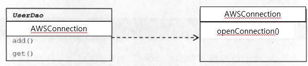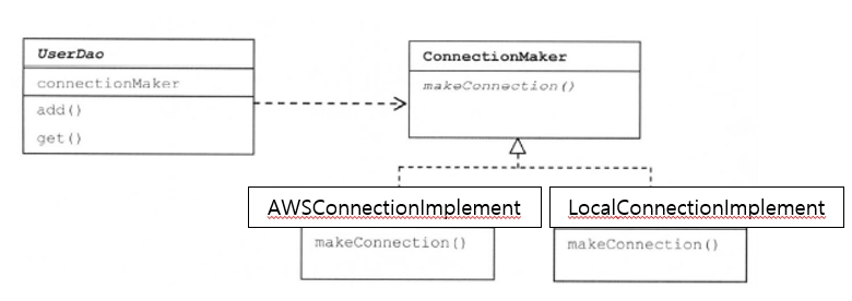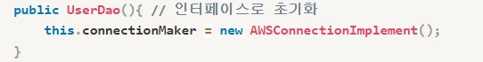 즉 , AWSConnection클래스의 생성자를 호출해서 오브젝트를 생성하는 코드가 여전히 UserDao에 남아 있다.
