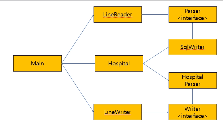 main : LineReader, LineWriter, Hospital를 사용하여 파일을 파싱하는 클래스
