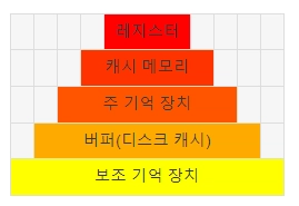 레지스터(CPU) - (캐시 메모리) - 주 기억 장치 - (캐시 메모리) - 보조 기억 장치