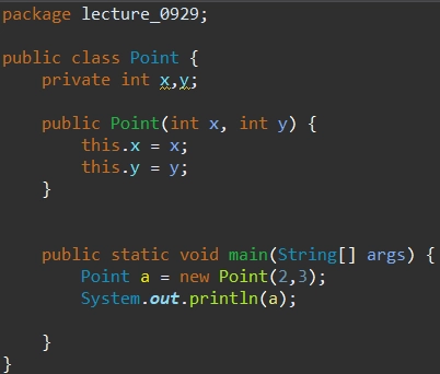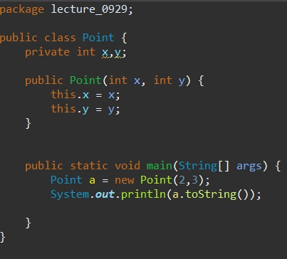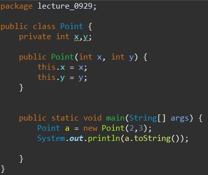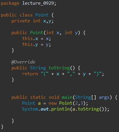 위의 코드를 통해, 오버라이딩된 toString() 메소드가 호출되어 (2,3)의 형태의 출력 결과를 얻을 것이다.