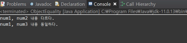 내용의 동일성은 전적으로 클래스 작성자가 정의할 문제이기 때문에, 클래스를 작성자가 equals() 메소드를 오버라이딩 하는 것이 원칙이다.