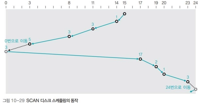 SCAN 디스크 스케줄링보다 효율이 좋지 않고 아사현상이 생길 수 있기 때문에 잘 사용되지 않느다