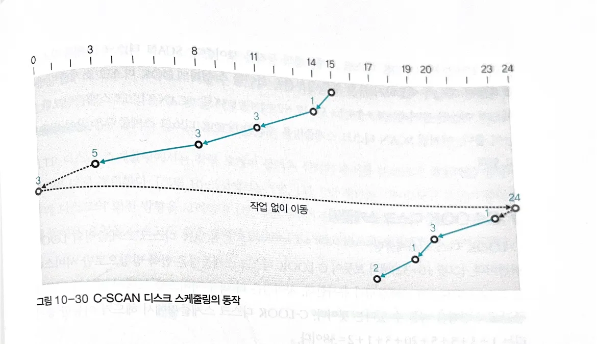 헤드가 한쪽 방향으로만 움직일 때는 요청받은 트랙을 서비스하고 반대 방향으로 돌아올 때는 서비스하지 않고 이동만 한다