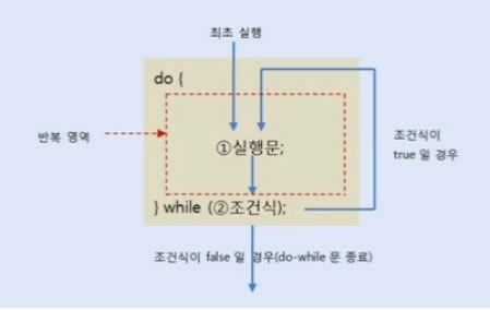 while은 조건식이 만족하지 않으면 한번도 실행 안될 수 있지만, do while은 조건식 상관없이 한번은 꼭 실행한다. ( 제일 두드러진 차이점 )
