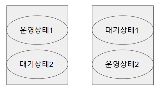 2개의 시스템이 각각의 고유 서비스를 수행하다가 한쪽 시스템에 장애가 발생하면 상대 시스템으로 작업을 이동하여 동시에 2개의 업무를 수행한다. 각 시스템은 장애 발생으로 인한 업무 이전에 대비하여 2개의 업무를 동시에 서비스할 수 있는 시스템 용량을 갖추고 있다.