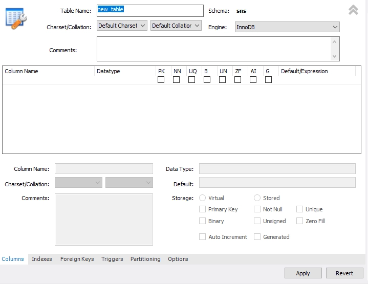 Table Name 입력하고, 원하는 Column Name과 Datatype을 선택하여 Apply 한다.