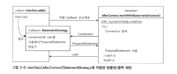 이제, UserDao 클래스 뿐만 아니라 다른 타입의 dao 클래스에서도 커넥션 생성 및 쿼리문 생성, 실행 등의 jdbc 일반적인 작업 흐름을 담고 있는 메소드를 실행시킬 수 있다.
