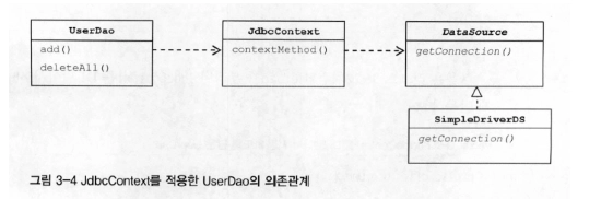 위의 코드는 jdbcContextWithStatementStrategy() 메소드를 JdbcContext 라는 독립된 클래스로 분리한 것이다.
