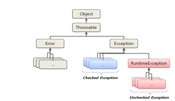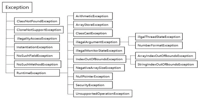 Unchecked Exception(=Runtime Exception) : 프로그램 실행 중 몇몇 상황에서 발생할 수 있는 예외. 예외 처리를 하지 않더라도 프로그램 실행 자체는 가능하나, 예외 상황 발생시 바로 프로그램이 정지함.