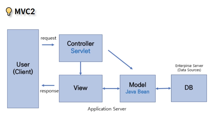 MVC1 구조와 달리 웹 브라우저의 요청을 하나의 서블릿이 받게 됨