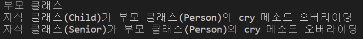 System.out.println("자식 클래스(Senior)가 부모 클래스(Person)의 cry 메소드 오버라이딩");