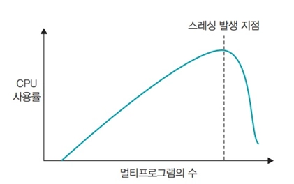 메모리 공간이 충분할 때에는 프로세스가 정상적으로 계속 올라오지만, 메모리가 부족한데 새로운 프로세스가 실행되면, 스왑아웃이 잦아져 페이지 부재가 잦아진다. 이로 인해 작업이 멈춘것 처럼 보이는 것을 말한다.
