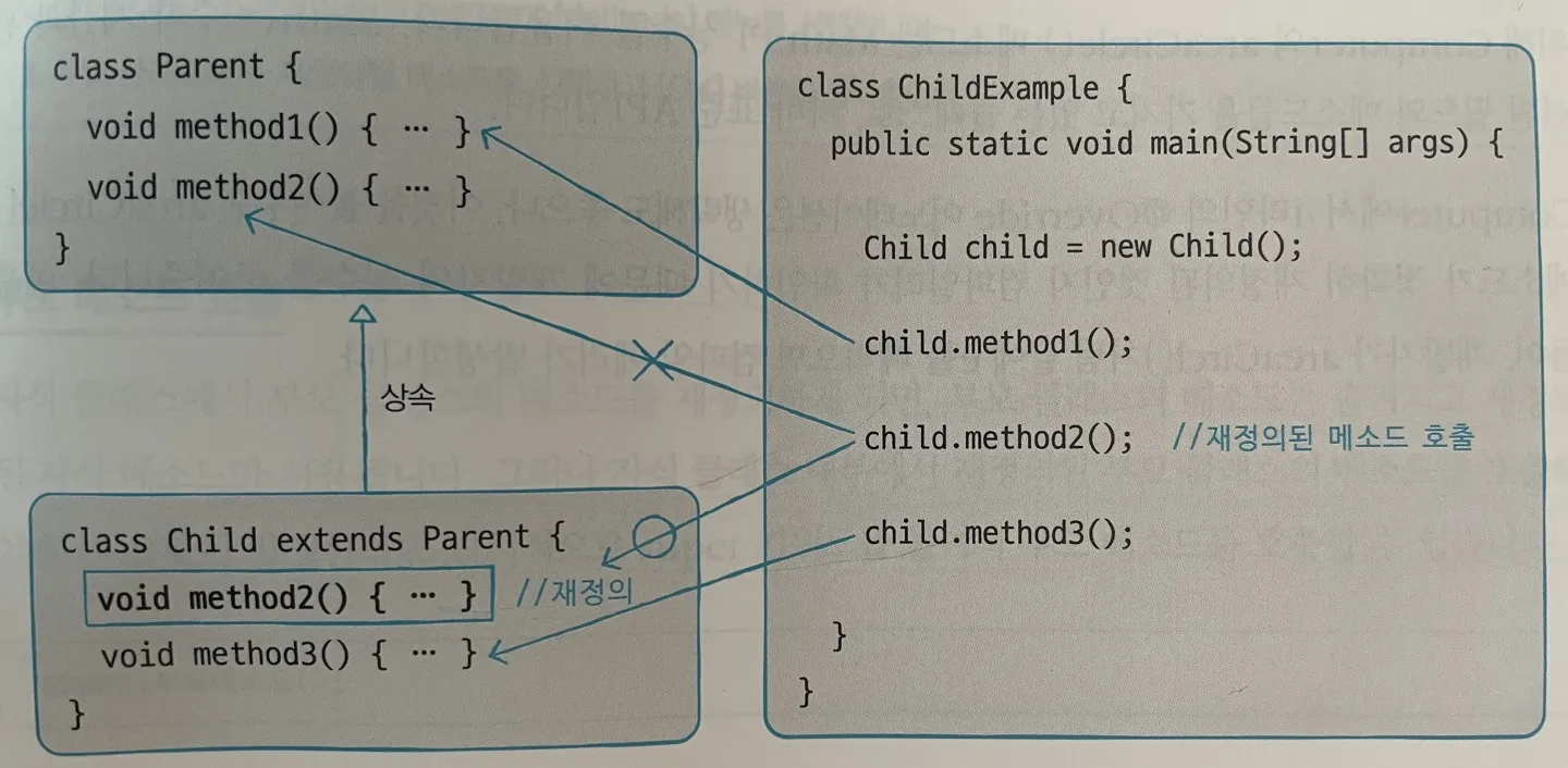 메소드가 재정의되었다면 부모 객체의 메소드는 숨겨지기 때문에 자식 객체에서 메소드를 호출하면 재정의된 자식 메소드가 호출된다.