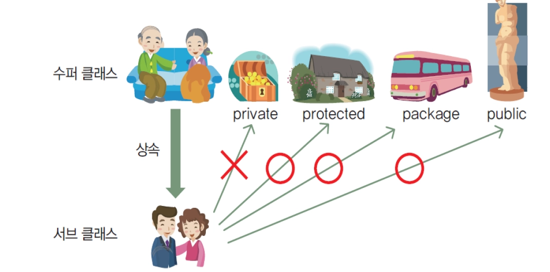 상속 시, 다른 패키지에 있는 자식클래스에서도 접근 가능