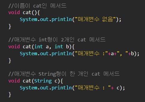 (이름이 cat인 메서드가 총 3개 있지만 매개변수의 유형과 개수가 다름)