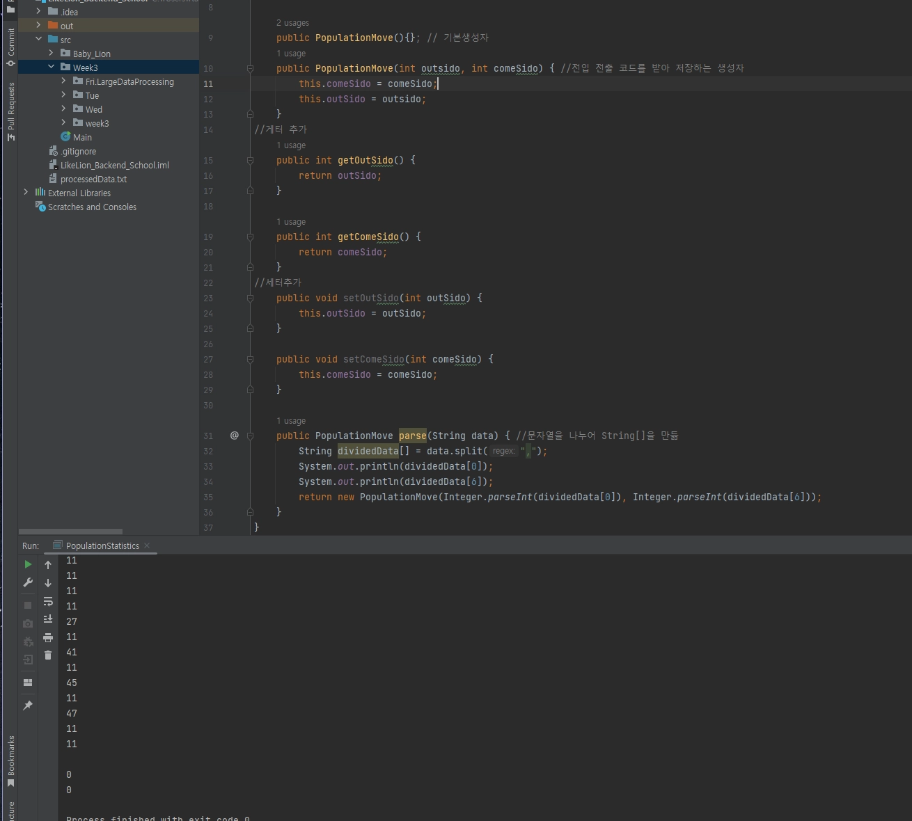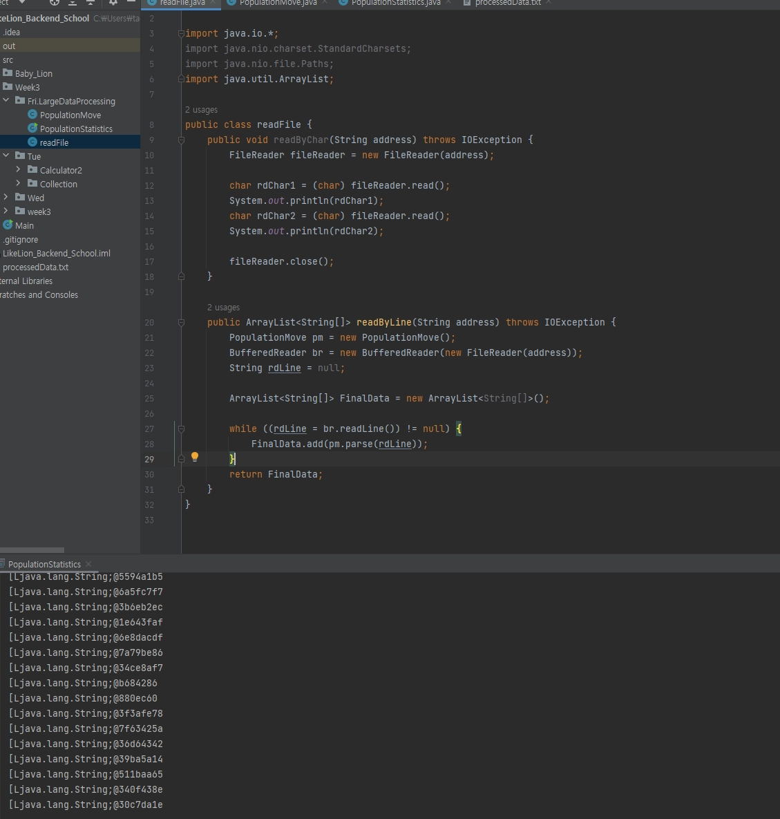 PopulationMove 에서 parse메소드로 스트링배열값을 반환해 readFIle에서 ArrayList로 반환하려함.