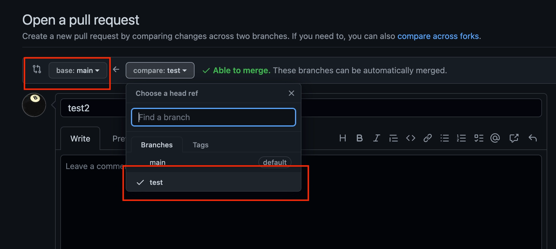 compare 부분에서 본인이 커밋한 브랜치를 선택하고 base에 main브랜치를 클릭해주세요.