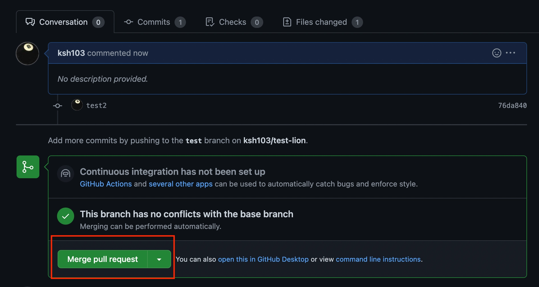 소스 코드끼리 충돌이 없으면 아래와 같이 뜹니다. 그럼 Merge pull request 해주시면 됩니다.