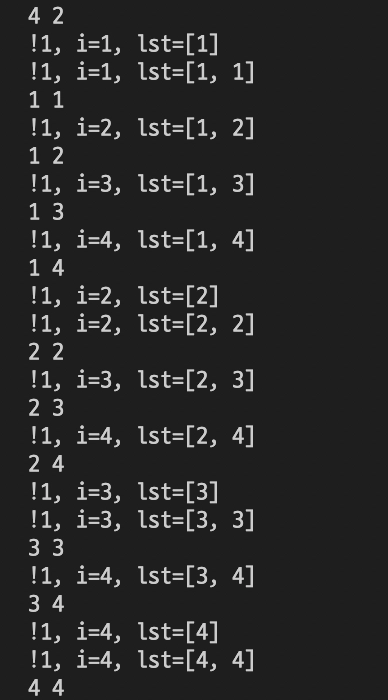 if len(lst) == m: # ๋ฆฌ์คํธ ๊ธธ์ด๊ฐ lst๊ณผ ๊ฐ์ ๊ฒฝ์ฐ ์ถ๋ ฅ