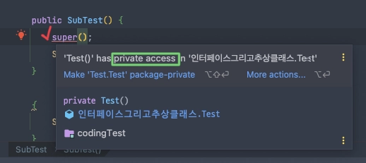 이 에러는 컴파일 타임에 잡아내는 오류가 아니다. 기본 생성자와 접근 제어자에 관련된 예외는 런타임 예외다.