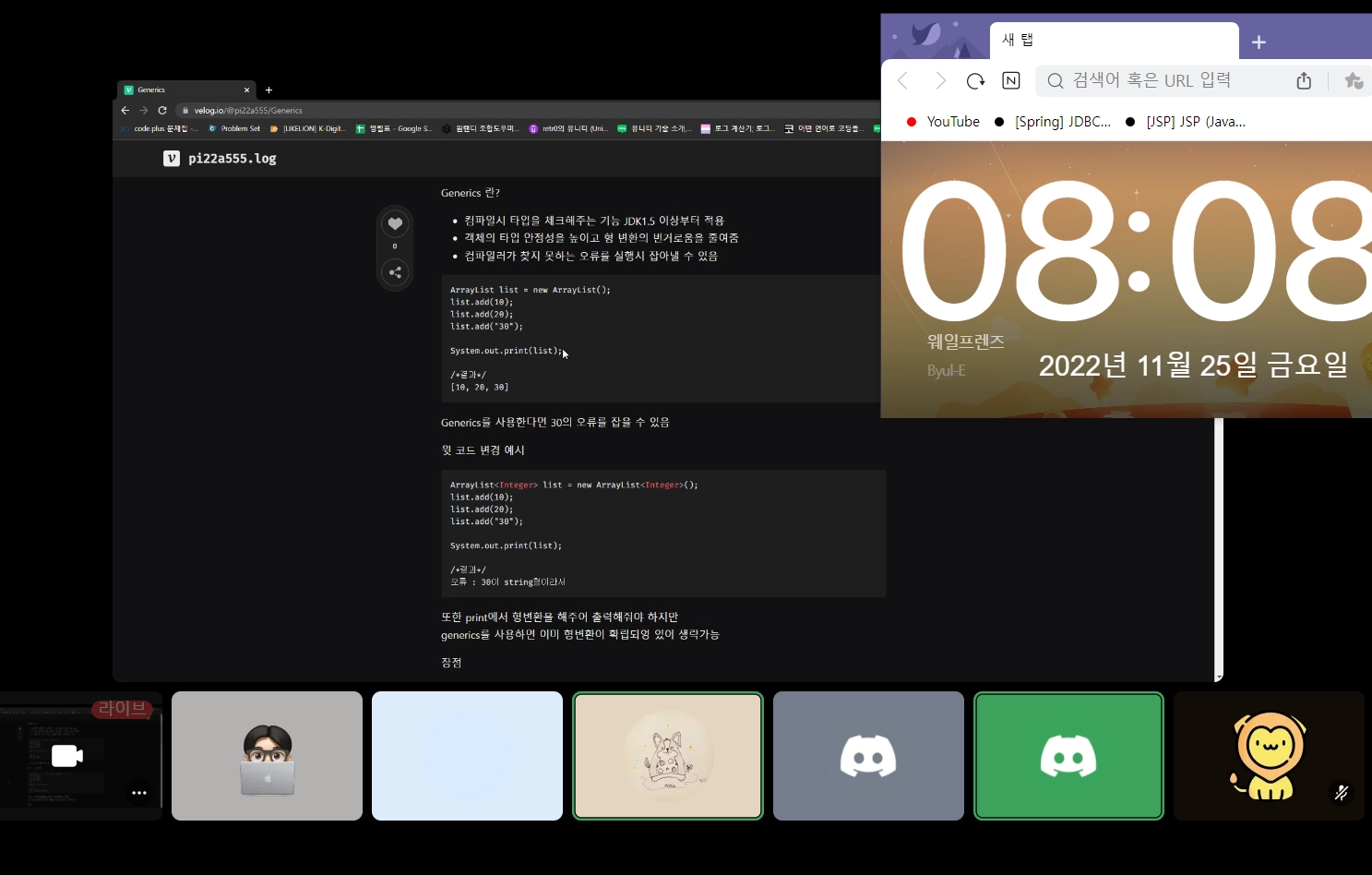김나영 | 제네릭에 대해 상세한 이론을 알지 못한 채 그냥 이럴 때 사용해야 겠구나 라는 생각만 가지고 있었는데 이번 기회로 조금 더 깊은 이론을 듣게 되어 많은 내용을 이해하게 되었습니다! 이번에 발표를 하신 분들이 너무 정리를 잘 해주셔서 몰랐던 부분도 많이 알게 되었고 서로 질문을 하고 스터디원분이 답변을 달아주신 것도 보면서 더 상세히 이해할 수 있는 너무 좋은 시간이었습니다. |
