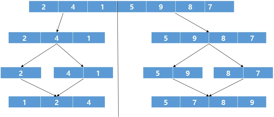 배열을 둘로 계속 나누고 합치면서 정렬한다