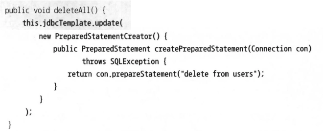 이전에 사용한 콜백( StatementStrategy 인터페이스의 makePreparedStatement() 메서드 )은 Template 콜백( PreparedStatementCreator 인터페이스의 createPreparedStatement() 메서드 )과 같음