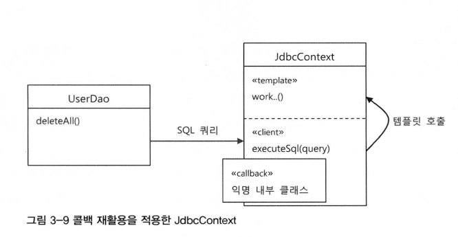 결국 그림과 같이 UserDao가 JdbcContext를 의존하면서 template과 client, callback을 사용하는 구조가 되었습니다. 이 방식으로 add()에도 적용할 수 있습니다.