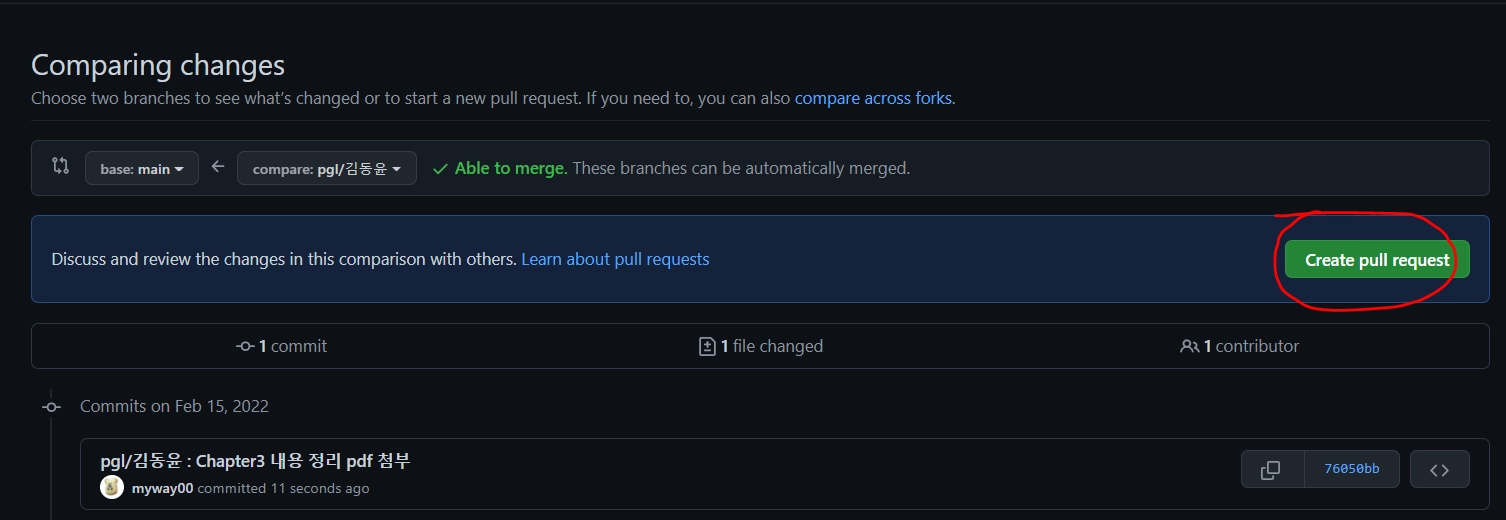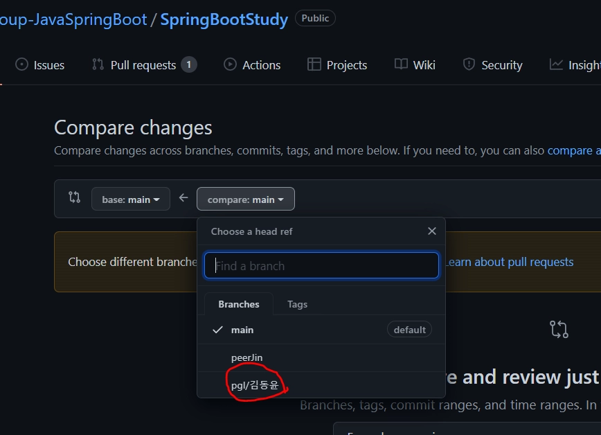 자신의 브랜치를 compare에서 지정 (저같은 경우는 pgl/김동윤!)