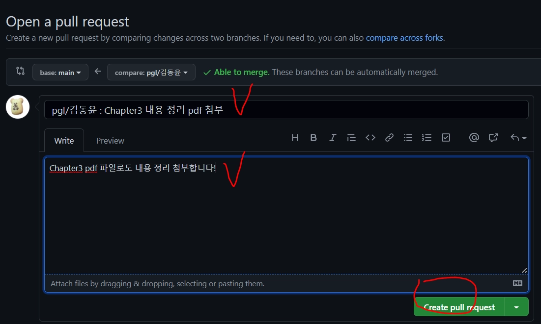 제목 & 내용 써주기 → create pull request 누르면 pr 만들어집니당 ㅎㅎ