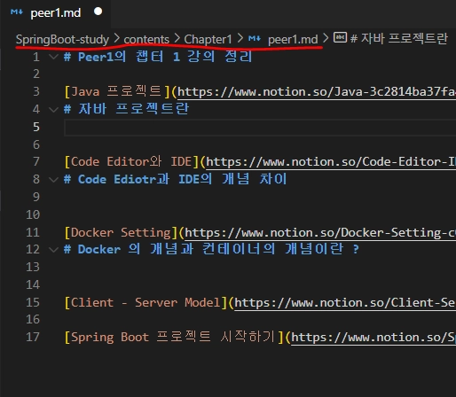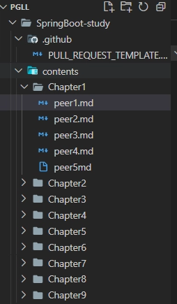만약 peer1 분이 Chapter1 강의를 듣고 정리해주신다고 하면 아래와 같은 파일 경로에 학습한 내용을 정리해주시면 됩니다. (각 chapter 의 소제목을 포함한 템플릿은 pgl이 만들어놓을 예정)