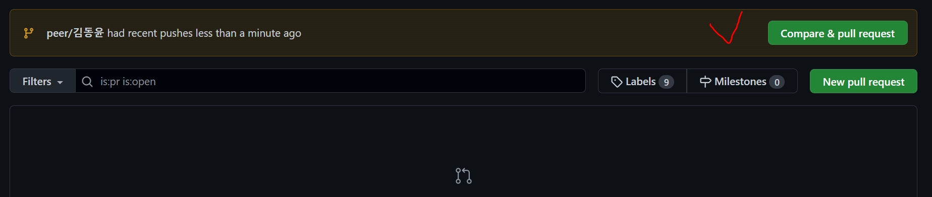 ⇒ (빨간 체크 부분 클릭) Compare, pull request 를 누르면