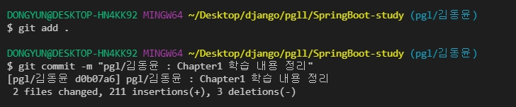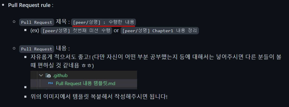 이때 커밋 메시지는 peer/자신의이름 : Chapter번호 학습 내용 정리 으로 해줍니다~
