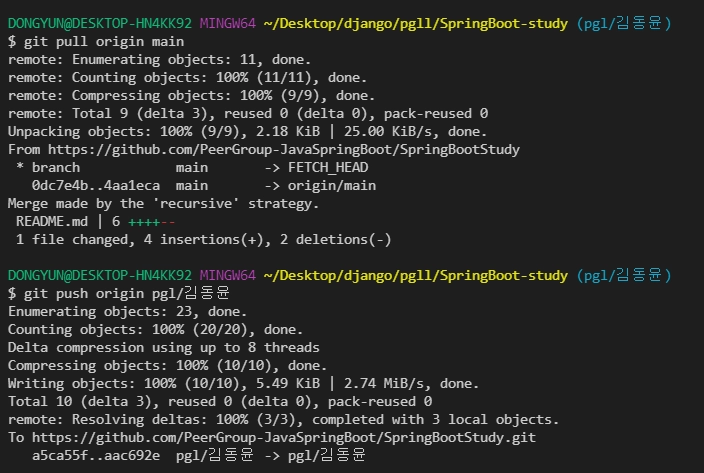 여기서는 git push origin peer/김동윤 으로 되겠네요!