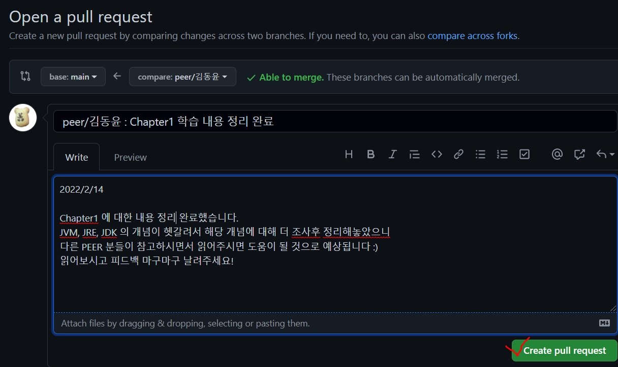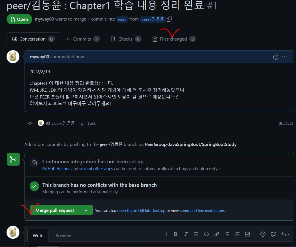 ⇒ peer들이 이 pull request를 merge 하기 전에 files changed를 눌러 해당 동료분이 추가하신 내용을 읽고 수정, 추가 되어야 할 사항들을 코멘트로 남겨주고 (없으면 넘어갈 수 있음)