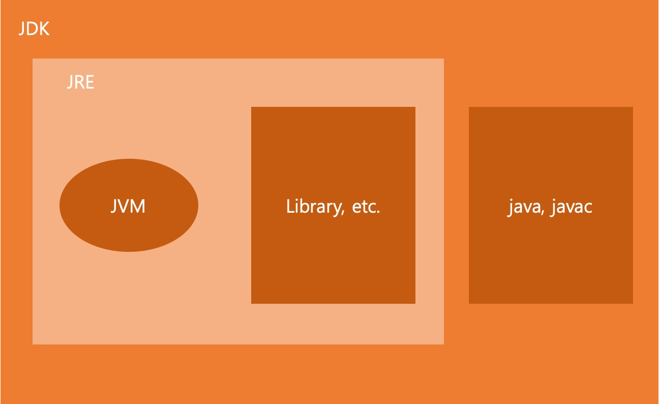 JVM - JRE - JDK의 관계는 위의 그림과 유사하게 생각할 수 있습니다. 기본적인 실행의 주체인 JVM, JVM이 사용하기 위한 도구를 모아둔 JRE, 그리고 JRE에서 실행하기 위한 기초를 다지기 위한 JDK라고 생각할 수 있습니다.