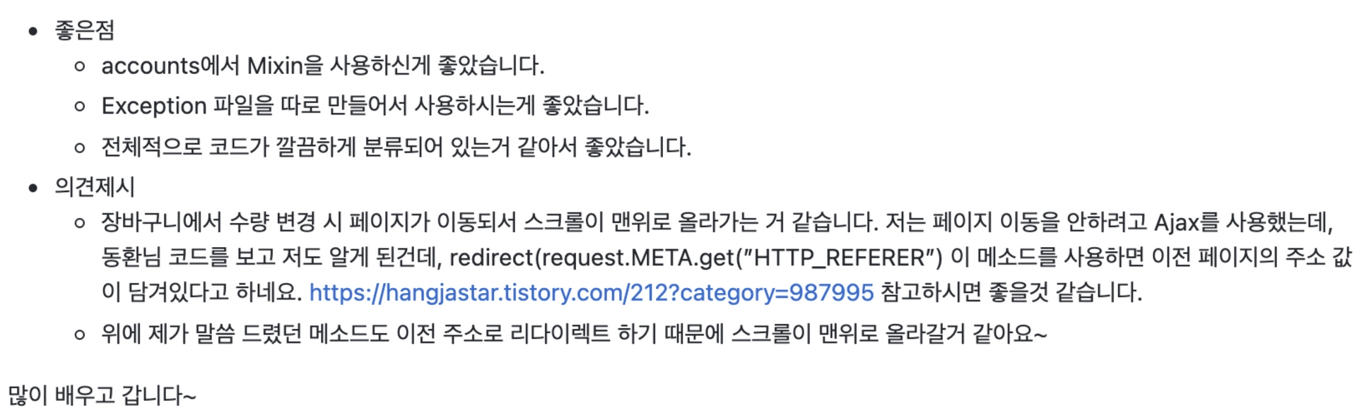 스타일 가이드를 잘 지켰는지 (이 부분은 팀 내의 코딩 컨벤션을 따릅니다.)