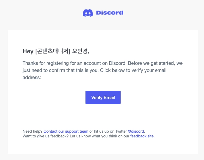 위의 주황색 바가 뜨면 가입한 메일로 들어가 Discord에서 온 메일을 확인합니다