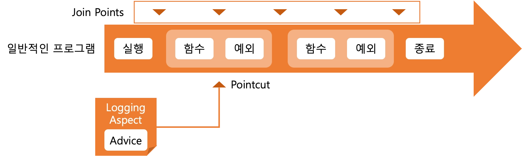실행과 종료 사이, 함수의 시작 전후, 예외의 전후 등 특정 기능이 실행되어야 하는 후보지점을 Joinpoint 라고 부릅니다.