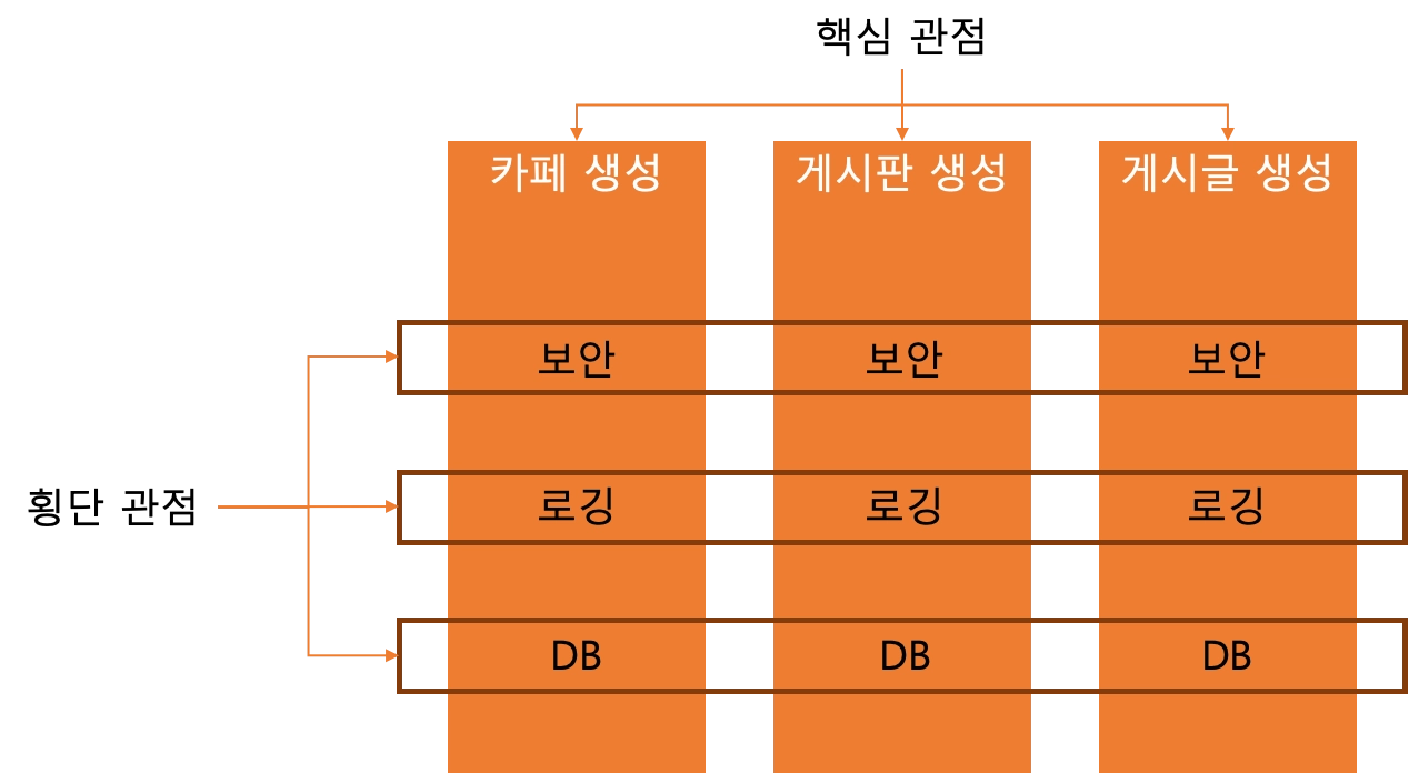 관점의 개념은 기본적인 프로그램 기능의 흐름과 같은 방향으로 흐르게 된다면 핵심 관점이라고 생각할 수 있습니다. 위의 개념에서, 카페 생성, 게시판 생성 등은 서비스 제공에 있어서 핵심적인 기능들 입니다. 이들은 각각 개별적인 객체, Spring 기준으로 Service 에서 제작할 수 있습니다.