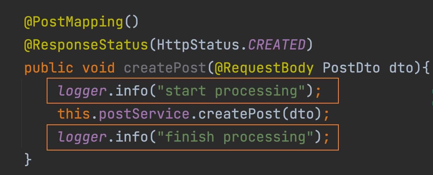 위의 그림과 같은 상황에서, 저희는 특정 기능을 가진 postService.createPost() 함수의 앞뒤로 로그를 남기고 있습니다. 여기에서 발전시킨다면 각 함수의 처리에 얼마나 시간이 걸리는지를 확인하기 위한 수정을 할 수도 있습니다. 이런 기능 처리의 소요시간을 계산하는 것은 어떤 함수에서든 사용할만한 기능입니다. 하지만 서비스의 흐름과 직접적인 연관이 없어서 각 객체에 따로 구현해야 합니다.